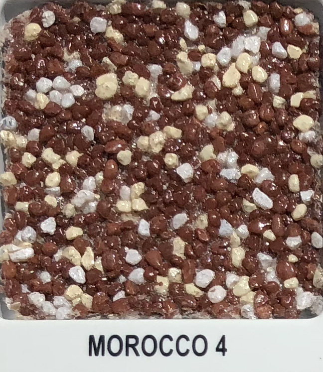 Эффект красивой мозаичной штукатурки достигается за счет использования каменной крошки высокого качества, а также за счет смешивания разных пород – так появляется яркий, устойчивый цвет. В качестве связывающего компонента используют акрил.